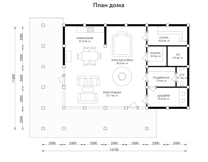 Одноэтажный загородный дом в стиле Фахверк станет уютным домом для Ваших гостей или прекрасным компактным решением для постоянного проживания. При разработке проекта мы предусмотрели установку финской сауны. Все в этом проекте говорит о счастливой загородной жизни вашей семьи и гостей. Терраса вокруг дома отлично подходит для прекрасного отдыха на лоне природы.